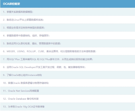 Oracle11g Certified Assoc≠♦iate (OCA) Oracle 認證專員(yuán)。考試成績通(tōng♣☆)過能(néng)獲得(de)Oracle公司為(wèi✘₩α)您頒發的(de)全球認證的(de)英文(wén)OCA證書(shū)。OC₩ A由Oracle公司出題。OCA是(shì)O$'racle認證體(tǐ)系的(de)入門(γ★¶mén)認證,證明(míng)你(nǐ)已掌握數(sh©π™ù)據庫的(de)基本知(zhī)識,可(kě)以日(rìβ≈ )常維護Oracle,創建用(yòng)戶、分(fēn)配權限;管理←γ>(lǐ)數(shù)據文(wén)件(jiàn)、管理(l™ ǐ)控制(zhì)文(wén)件(jiàn)、管理(lǐ★&> )日(rì)志(zhì)文(wén)件(jiàn);常用(yòng)♠&±↑的(de)備份、恢複方法。